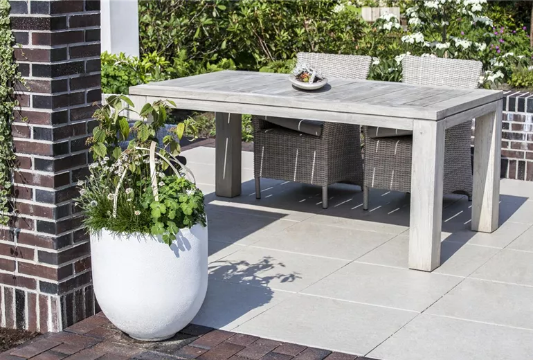 Weitere wichtige Kriterien sind die Wetter- und UV-Beständigkeit. Regen, Wind, Hitze und Kälte dürfen den robusten Tischen und Stühlen nichts anhaben – erst recht nicht, wenn sie den ganzen Winter über draußen bleiben müssen. Falls es keinen Überwinterungsplatz im Keller gibt, sollten sie wenigstens mit einer Schutzhülle abgedeckt werden. Wer eine platzsparende Variante benötigt, wählt stapelbare Stühle (sind schnell weggeräumt, wenn sie nicht gebraucht werden) oder Bänke.