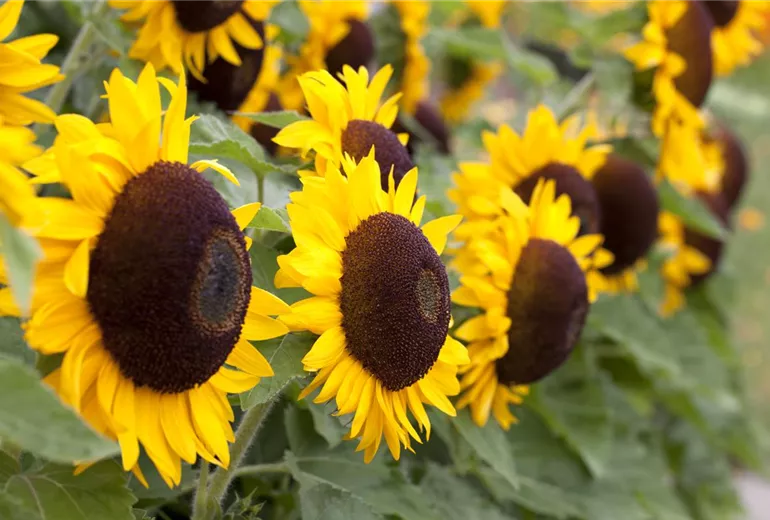 Die wohlbekannten gelben Sonnenblumen verbreiten Sonnenschein und gute Laune. Inzwischen sind unterschiedliche, auch kleinblütigere Sorten mit kürzeren Stielen im Fachhandel als Schnittblume erhältlich.